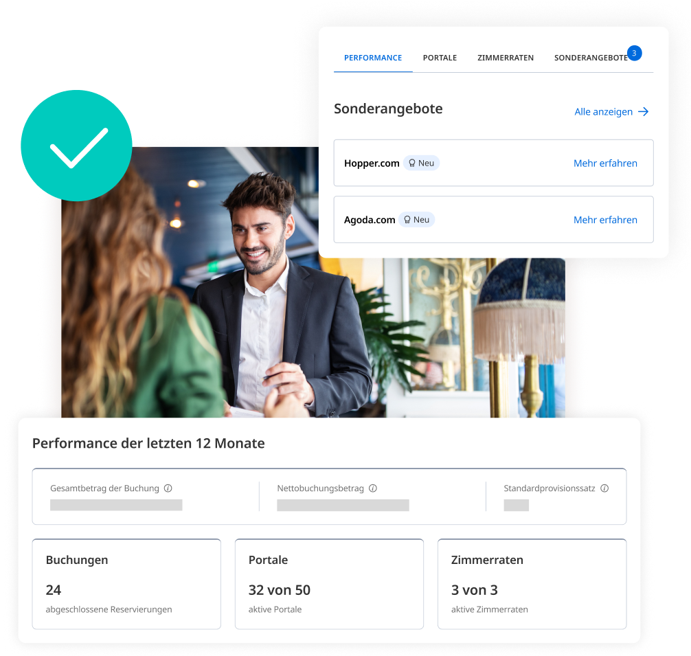 Verwalten Sie die Inhalte, Preise, Verfügbarkeiten und Live-Buchungsergebnisse Ihrer Portale von Ihrem Dashboard aus.