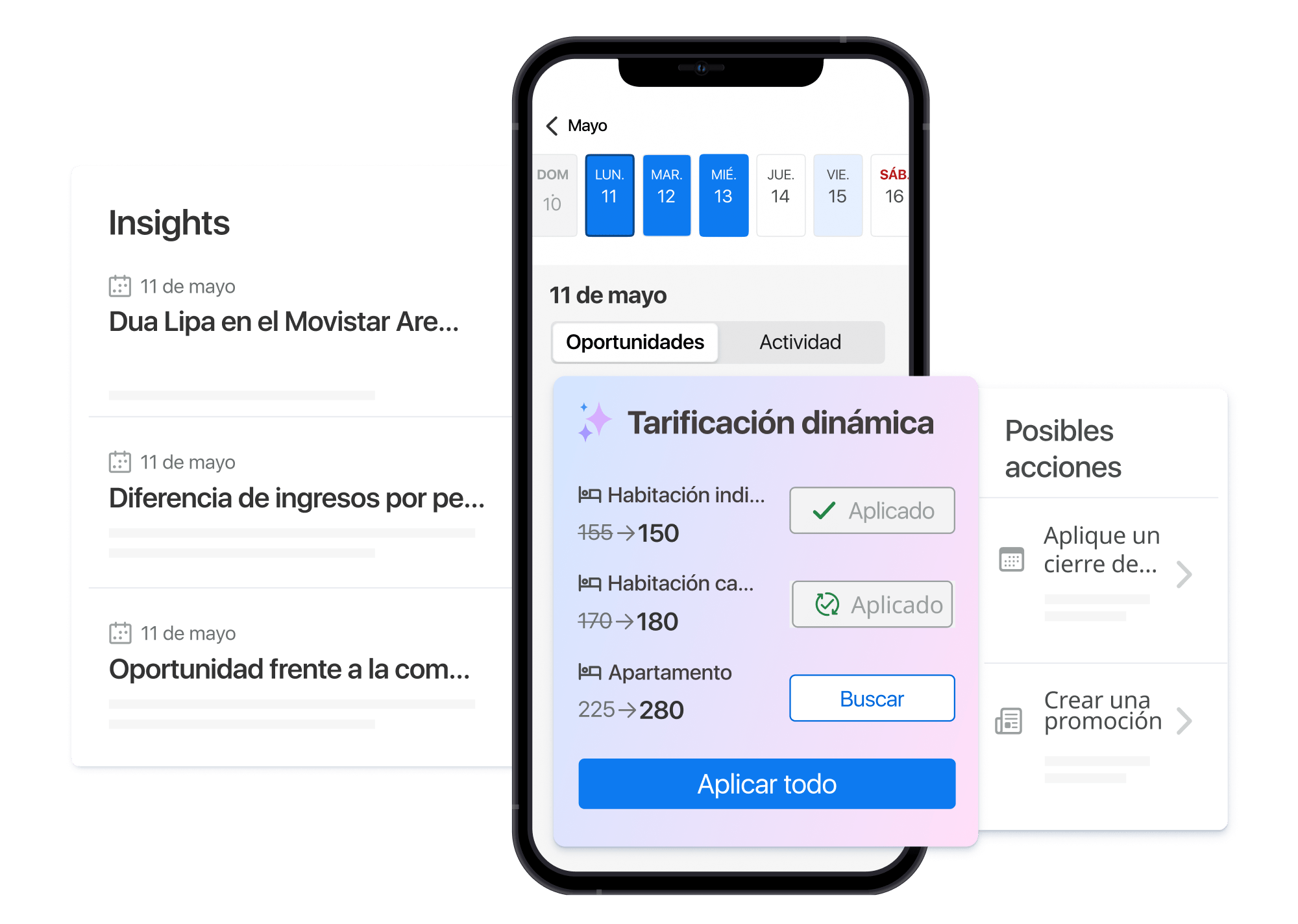 Ya no tendrás que estar delante de la pantalla ni en la oficina: recibe al instante alertas de oportunidades inesperadas y ajusta las tarifas o la distribución en todos tus canales desde una misma plataforma.