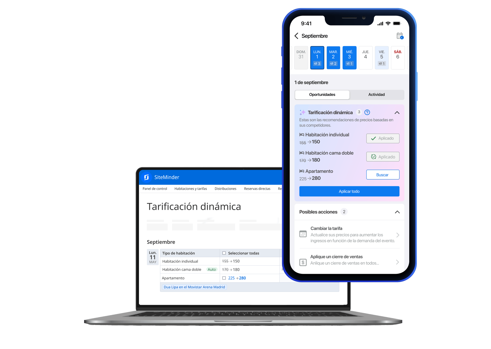 Ajusta tarifas y canales al instante desde tu móvil, estés donde estés, o gestiona todo desde la plataforma SiteMinder cuando prefieras.