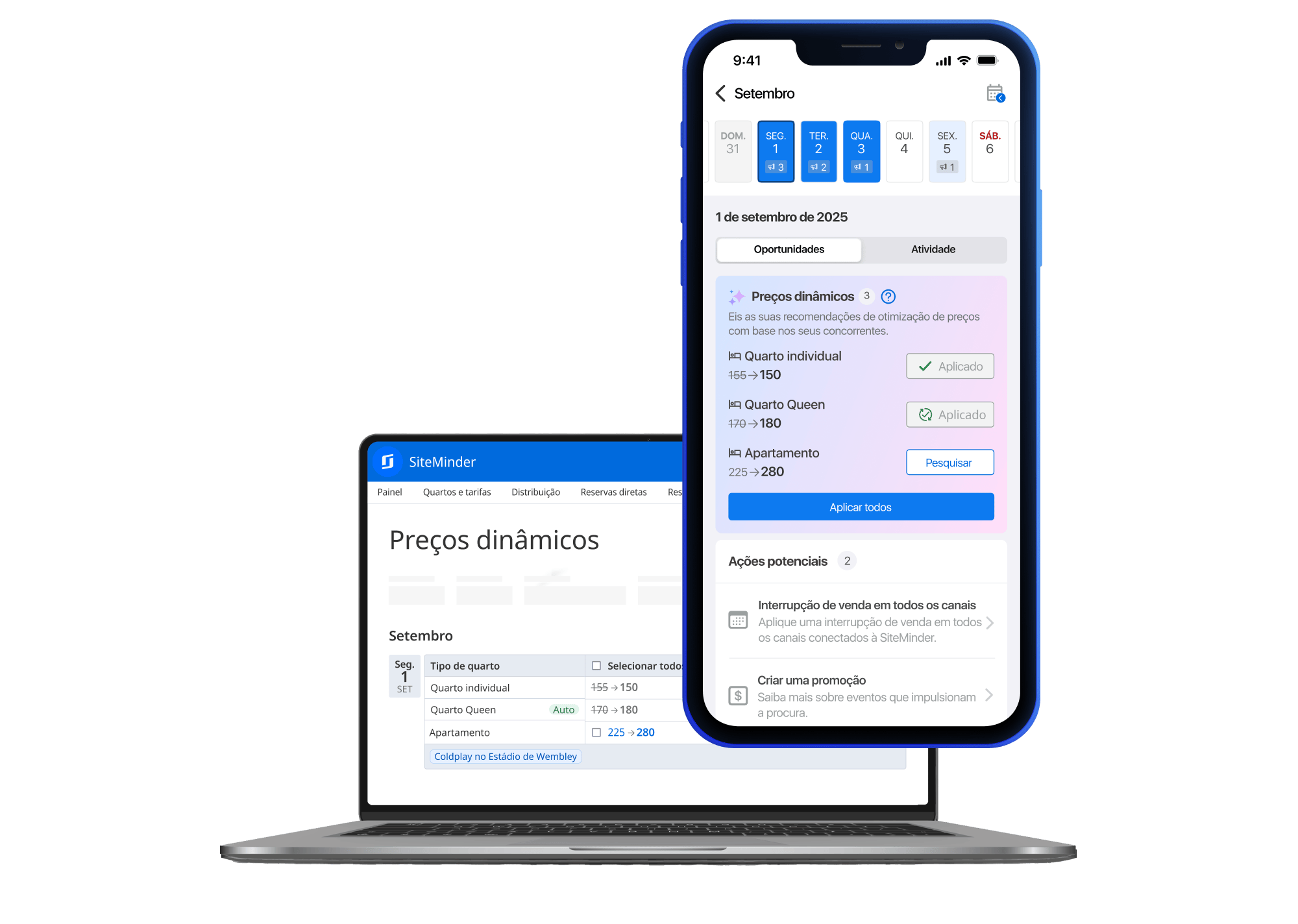 - Alertas e atualizações personalizadas – Receba alertas móveis com recomendações personalizadas com a app móvel da SiteMinder. Colocamos todos os dados necessários na ponta dos seus dedos, para ajudar a fazer mudanças táticas rápidas, em qualquer lugar.